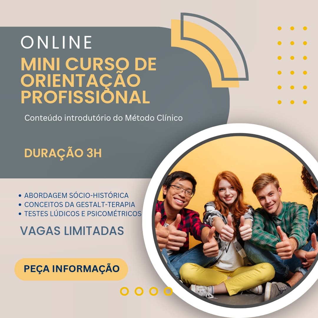 Mini Curso de Orientação Profissional - OP voltado exclusivamente para psicólogos que atuem no campo Clínico. Curso introdutório para quem quer se familiarizar com os conteúdos da OP. O Curso é no Método Clínico e transita na abordagem sócio-histórica e em conceitos da Gestal-Terapia. Os testes são, essencialmente, lúdicos e projetivos, embora mencione testes psicométricos. As vagas são super limitadas e se encerram no dia 17/03. Currículo: Psicóloga com especialização Clínica na abordagem da Gestalt-Terapia, com formação em Orientação Profissional e Carreira. Mestre em Psicologia Social (UERJ) e MBA em Gestão de Negócios (IBMEC) #orientaçãoprofissional#gestalterapia#profissao https://www.instagram.com/p/CppZfdcOUml/?igshid=MDJmNzVkMjY=
